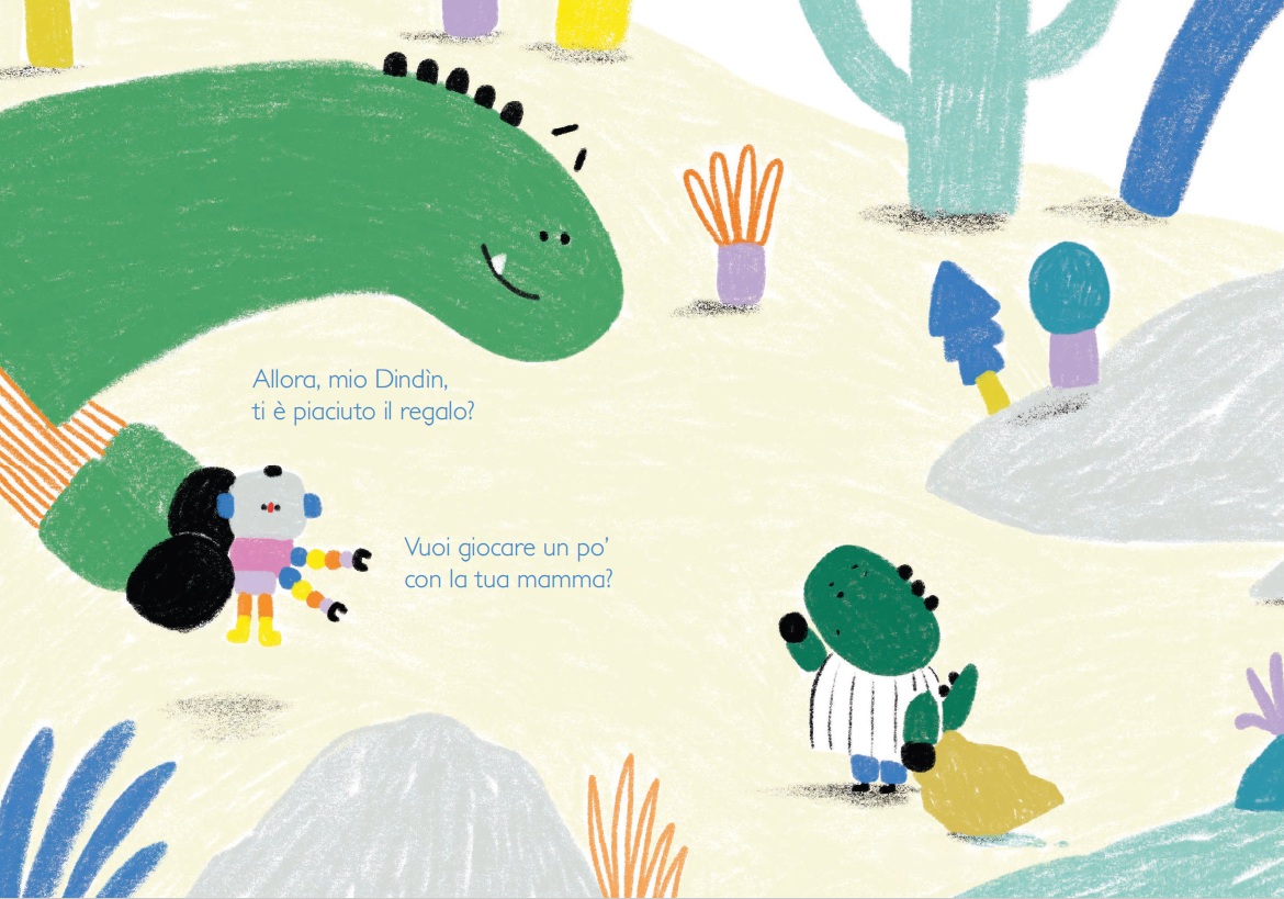 E il regalo vero e proprio? Quando arriva il dinosauro adulto per scoprire se è piaciuto, la risposta è inaspettata: Dino aveva già ricevuto il regalo più bello — un mare di cose da inventare.