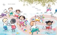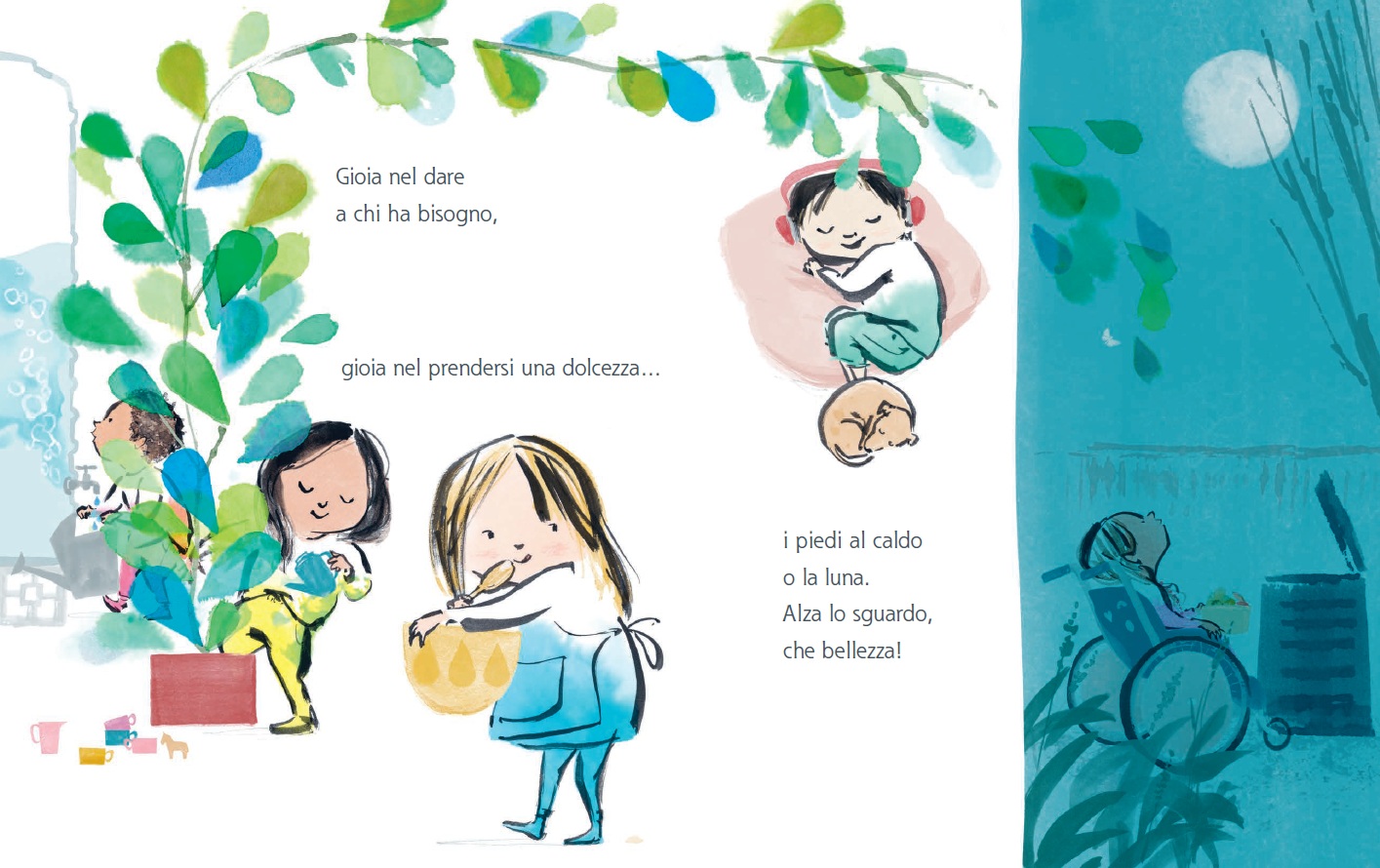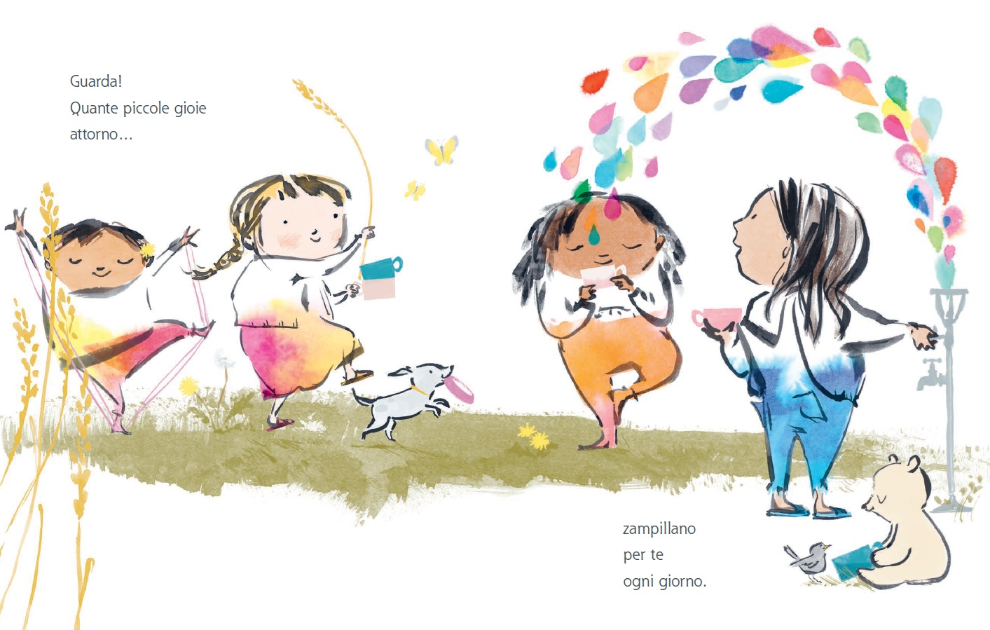 La felicità è fatta di attimi: come gocce d’acqua che zampillano leggere riempiendo la nostra giornata. Questo albo ci invita a rallentare lo sguardo per riconoscerle: una corsa sull’altalena, una mano che ci accarezza, un cane che gioca, una sorpresa nascosta tra le foglie, un sorriso condiviso.
