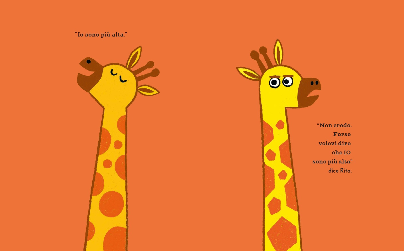 Rafy e Rita sono due giraffe gemelle: identiche in tutto… o quasi. Perché, a sentir loro, ognuna è sempre un pochino più alta dell’altra. E così, da una semplice provocazione, nasce una sfida irresistibile a colpi di fantasia.
