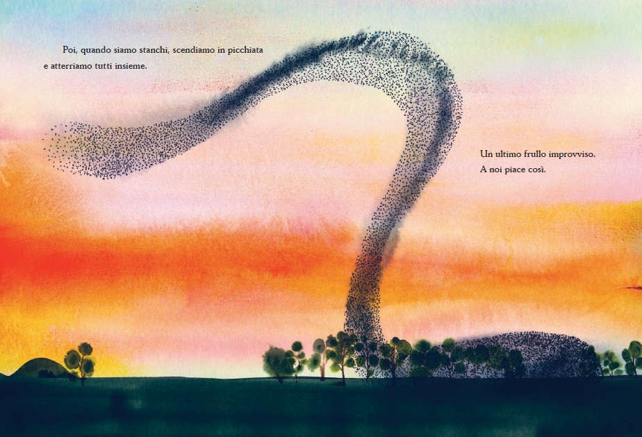 Le illustrazioni di Marc Martin sono il cuore visivo del libro: acquerelli fluidi e luminosi che danno forma al movimento e lo rendono tangibile. Gli stormi diventano figure in continua metamorfosi – onde, serpenti d’aria, ali immense – in tavole di grande suggestione, sospese tra delicatezza e potenza.