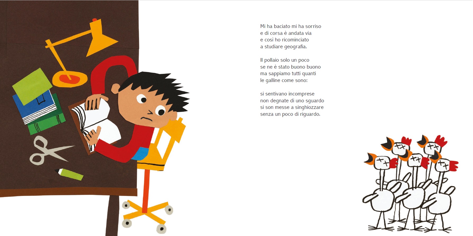 Con il suo tratto inconfondibile e il ritmo travolgente della rima, Gek Tessaro costruisce un piccolo capolavoro di comicità e poesia: una casa popolata di adulti strampalati, animali esagerati e un bambino che, tra piume e risate, cerca solo un po’ di pace per studiare.